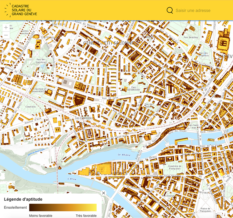 L’objectif du projet G2-SOLAIRE est, à travers le cadastre solaire, d’intensifier l’usage de l’énergie solaire sur le Grand Genève, de générer des activités économiques autour de la filière solaire, et de contribuer in fine à atteindre les objectifs de transition énergétique dans un contexte de densification urbaine. Le cadastre solaire qui est produit offre un potentiel d’énergie solaire effectif sur l’agglomération tenant compte de l’irradiation solaire incidente sur le territoire.”